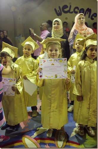 N’s Kindergarten class spent many weeks preparing for their graduation ceremony. It’s a big deal. They learned songs in Arabic and English. They had outfit changes (a matching H&M dress I had to buy for her and a graduation gown later). They had speaking parts. There were props and a background. Pretty fun and kinda exhausting. She was the only foreign child there and she didn’t care one smidgen.
